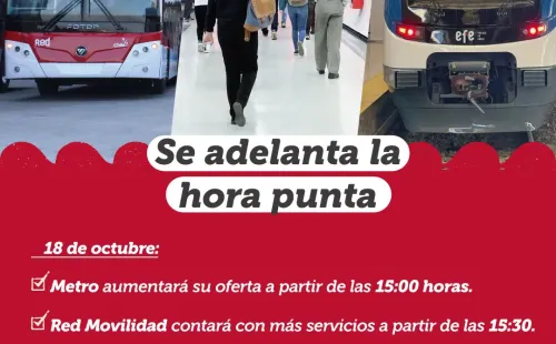 Se informó por parte del Gobierno y Metro de Santiagoque estemartes 18 de octubrea raíz de la conmemoración delEstallido Social, Metro adelantará la hora punta desde las 15:00 hrs.