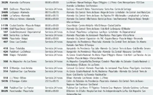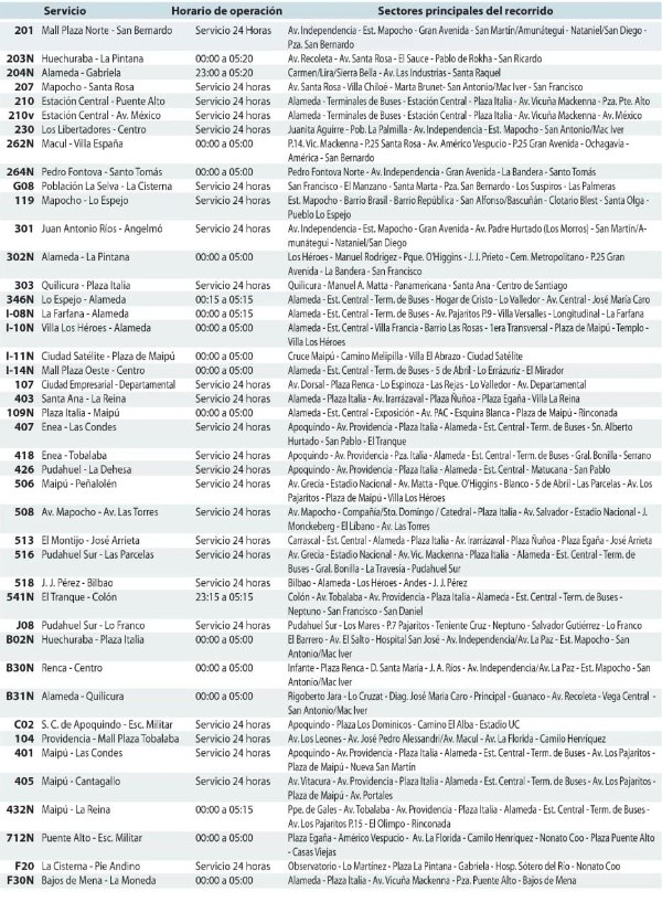 En total, 43 servicios realizan recorridos entre las 00:00 y las 5:30 am, con lo que entregarán una cobertura en el 100% de las comunas donde opera el transporte público de Santiago. De ellos, 23 funcionarán las 24 horas del día y 18 lo harán sólo durante la madrugada.