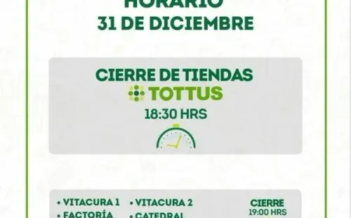 Por su parte, Tottus también inicia su cierre a las 18:30. Sin embargo, los locales de Vitacura, Factoría, Walker Martínez, Catedral y Pajaritos cerrarán a las 19:00 horas.