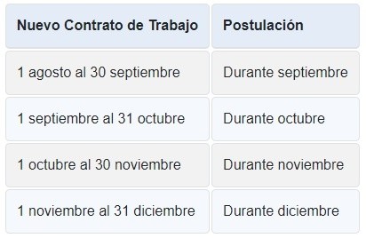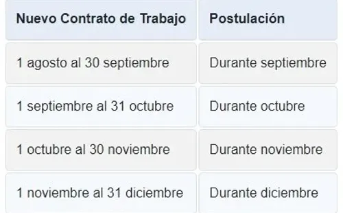 Las postulaciones iniciaron oficialmente el 1 de septiembre. Sin embargo, la fecha exacta de solicitud dependerá de cuándo se firme el contrato del nuevo trabajo, como se indica en el siguiente cuadro: