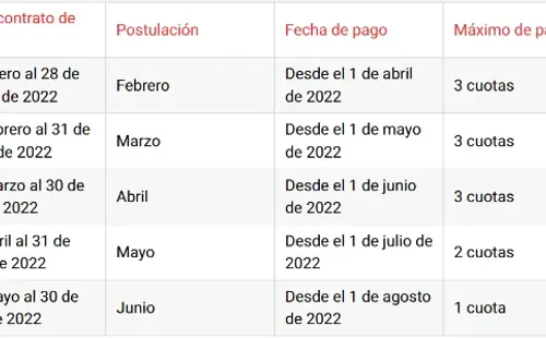 Cabe mencionar que los contratos realizados entre enero y febrero tendrán plazo para postular hasta el 28 de febrero. Por lo que si logran postular exitosamente durante el mes de febrero, marzo y abril recibirán hasta 3 meses de pago.