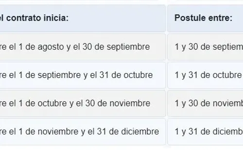 Las postulaciones inician en septiembre. La fecha exacta de solicitud dependerá de cuándo se firme el nuevo contrato, como se indica en el siguiente cuadro: