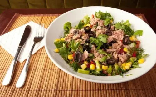 Mezcla lechuga, tomate, pepino, cebolla morada y atún enlatado en agua. Agrega un aderezo de limón y aceite de oliva.