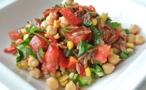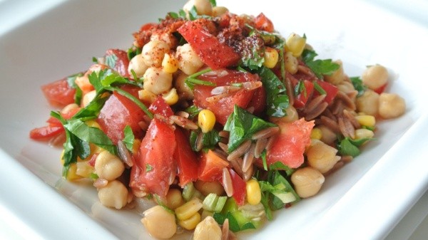 Mezcla garbanzos cocidos con tomate, pepino, cebolla morada, aceitunas y perejil. Adereza con una vinagreta de limón y aceite de oliva.
