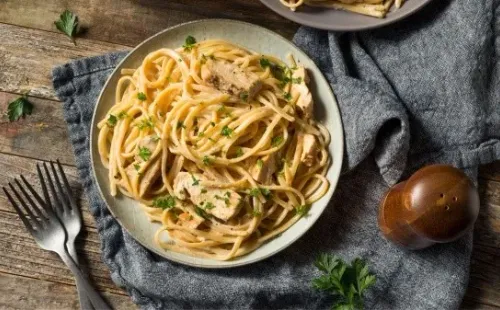 Cocina pasta fettuccine al dente y reserva. Saltea espinacas en aceite de oliva y ajo. Agrega crema de leche, queso parmesano rallado y la pasta cocida.