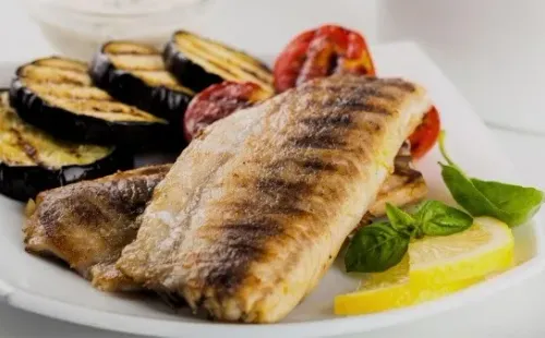 Coloca filetes de pescado en una bandeja para hornear y rodea con verduras como cebolla, pimiento y zapallo. Adereza con aceite, sal, pimienta y limón. Hornea hasta que el pescado esté cocido.