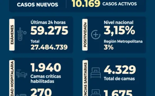Se registróunapositividad de un 3,15% a nivel paísy de un 3% en la Región Metropolitana,lamentando elfallecimiento de 22personasa causa del virus.Destacando queloscasos activos son 10.169al día de hoy.