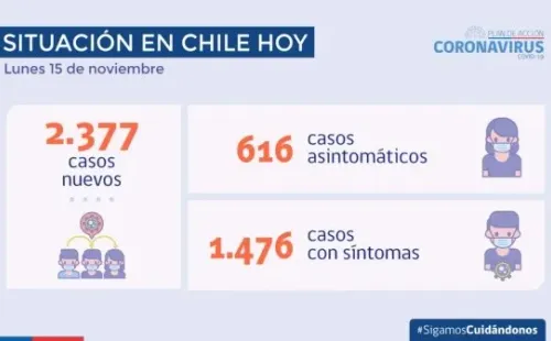 Este lunes el Ministerio de Salud informó un nuevo balance diario, donde se registraron2.377 nuevos contagios y los casos activos bajaron de los 15.000, llegando a 14.909 personas contagiantes.
