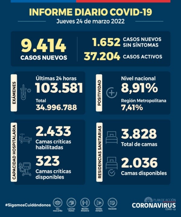 Hace pocos minutos el Ministerio de Salud (Minsal) reportó9.414 casos nuevos de Covid-19en las últimas 24 horas, donde5.470 corresponden a personas sintomáticas y 1.652 no presentan síntomas.