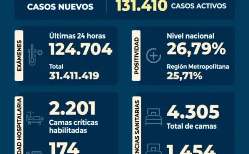 Se registróunapositividad de un 26,79%a nivel paísy de un 25,71% en la Región Metropolitana,lamentando elfallecimiento de 94personasa causa del virus.Destacando queloscasos activos son 131.410al día de hoy.