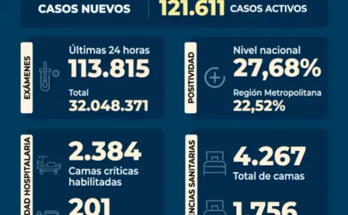 Se registróunapositividad de un 27,68%a nivel paísy de un 22,52% en la Región Metropolitana,lamentando elfallecimiento de 131personasa causa del virus.Destacando queloscasos activos son 121.611al día de hoy.