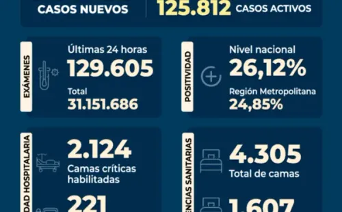 En cuanto a la positividad diaria, el indicador llegó al26,12% de los129.605 exámenes PCR y Antígenos. Por su parte, la positividad semanal se ubicó en 24,41%.