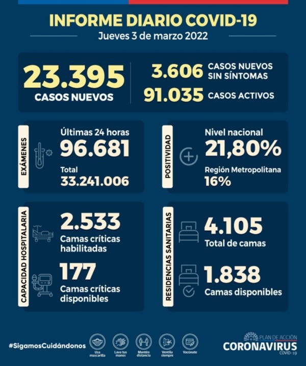 Este jueves 3 de marzo el Ministerio de Salud informó que hay23.395 casos nuevos y91.035 casos activos en las últimas 24 horas, lo que representa una disminución de 7.280 casos diarios y 15.098 casos activos respectivamente, en comparación al informe de hace siete días.