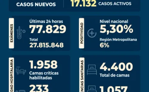 Se registróunapositividad de un 5,30%a nivel paísy de un 6% en la Región Metropolitana,lamentando elfallecimiento de 19 personasa causa del virus.Destacando queloscasos activos son 17.132al día de hoy.