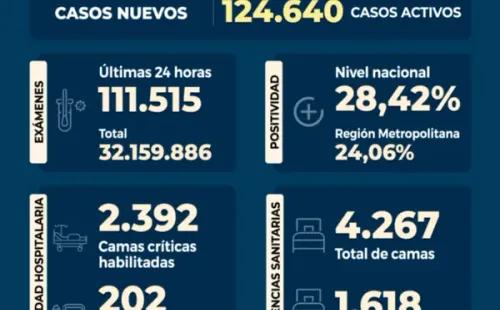Se registróunapositividad de un 28,42%a nivel paísy de un 24,06% en la Región Metropolitana,lamentando elfallecimiento de 129personasa causa del virus.Destacando queloscasos activos son 124.640al día de hoy.