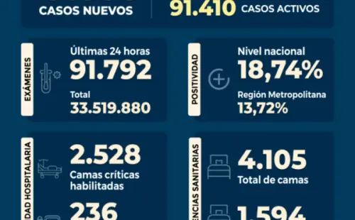 Se registraunapositividad de un 18,74% a nivel paísy de un 13,72% en laRegión Metropolitana,lamentando elfallecimiento de 122personasa causa del virus.Destacando queloscasos activos son 91.410 al día de hoy.