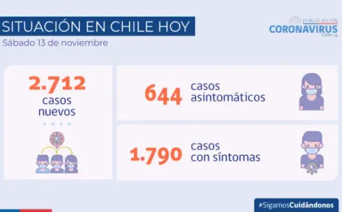 En el balance Covid-19 de hoy sábado 13 de noviembre, el Minsal entregó nuevos detalles de la situación del coronavirus en Chile. La autoridad reportó 2.712 nuevos casos de coronavirus, de los cuales 1.790 son sintomáticos, 644 asintomáticos y 278 sin notificar. De esta forma, Chile alcanza un total de 1.723.728 contagios desde que inició la pandemia.