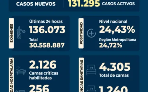 Se registróunapositividad de un 24,43%a nivel paísy de un 24,72% en la Región Metropolitana,lamentando elfallecimiento de 63personasa causa del virus.Destacando queloscasos activos son 131.295al día de hoy.