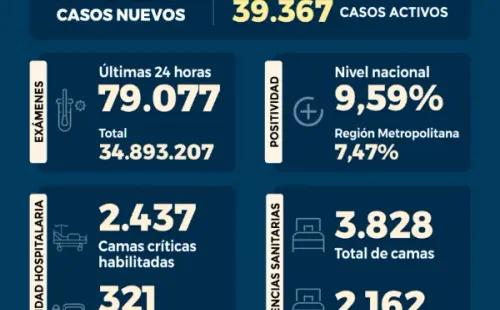 En las últimas 24 horas se presentó una positividad del 9,59% a nivel nacional, con 79.077 exámenes PCR y test de antígeno. Mientras que la Región Metropolitana es de 7,47%.