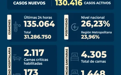 Se registróunapositividad de un 26,23%a nivel paísy de un 23,96% en la Región Metropolitana,lamentando elfallecimiento de 97personasa causa del virus.Destacando queloscasos activos son 130.416al día de hoy.