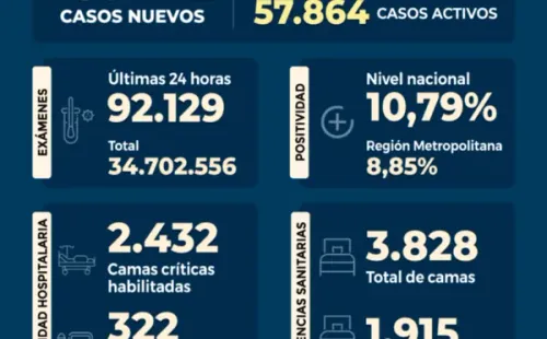 Se registraunapositividad de un 10,79% a nivel paísy de un 8,85% en laRegión Metropolitana,lamentando elfallecimiento de 78personasa causa del virus.Destacando queloscasos activos son57.864al día de hoy.