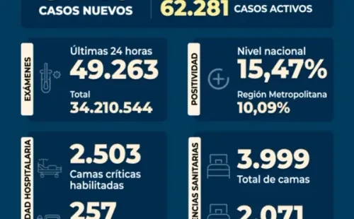 Se registraunapositividad de un 15,47% a nivel paísy de un 10,09% en laRegión Metropolitana,lamentando elfallecimiento de 34 personasa causa del virus.Destacando queloscasos activos son62.281al día de hoy.