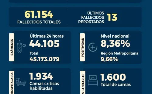 Se registraunapositividad de un 8,36% a nivel paísy de un 9,66% en laRegión Metropolitana, lamentando elfallecimiento de 13personareportadas a causa del virus.Destacando queloscasos activos son 14.805al día de hoy.