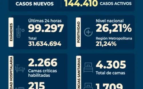 Se registróunapositividad de un 26,21%a nivel paísy de un 21,24% en la Región Metropolitana,lamentando elfallecimiento de 108personasa causa del virus.Destacando queloscasos activos son 144.410al día de hoy.