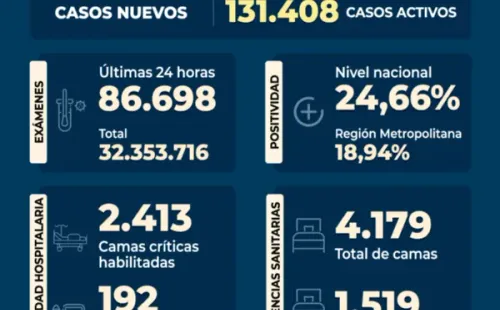 Se registraunapositividad de un 24,66%a nivel paísy de un 18,94% en la Región Metropolitana,lamentando elfallecimiento de 144personasa causa del virus.Destacando queloscasos activos son 131.408al día de hoy.