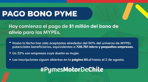 Las postulaciones estarán habilitadas hasta el 2 de agosto y para solicitar el beneficio o revisar el estado de pago del bono, se debe ingresar al sitio web del Servicio de Impuestos Internos en el siguiente sitio en la pestaña “Solicitar y Consultar Bono Alivio MYPES”.