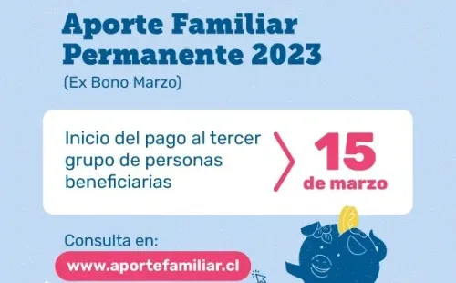Desde mediados de febrero y durante todo el mes de marzo se paga el Aporte Familiar Permanente, más conocido como Bono Marzo 2023, el cual entrega un monto de 59.452 pesos por cada familia o carga familiar debidamente acreditada. Y este miércoles comenzó a entregarse el pago al tercer grupo de beneficiarios.