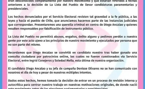 De esta manera La Lista del Pueblo se desmarcó de su candidato presidencial por el caso de firmas y anunció que tomarán acciones legales contra el abanderado y quienes resulten responsables de la falsificación de instrumento público.