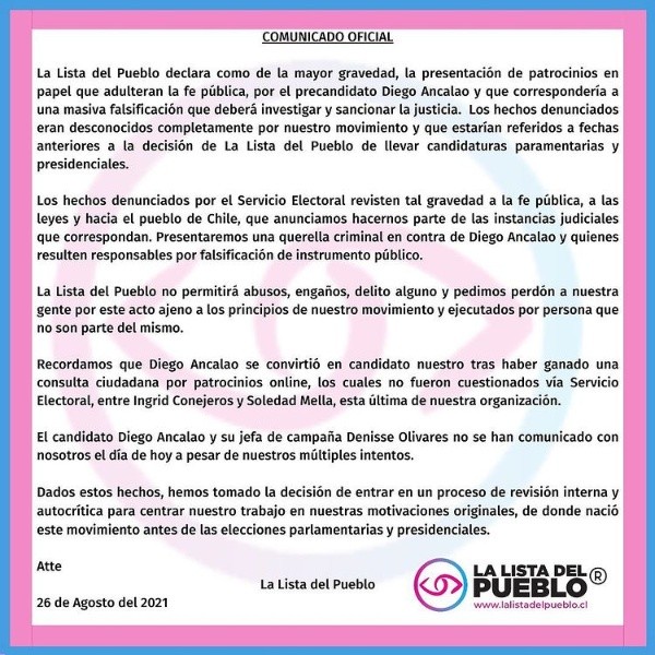 “Los hechos denunciados por el Servicio Electoral revisten tal gravedad a la fe pública, a las leyes y hacia el pueblo de Chile, que anunciamos hacernos parte de una querella criminal contra Diego Ancalao”.