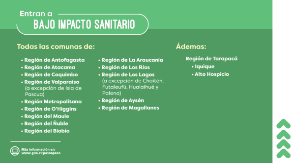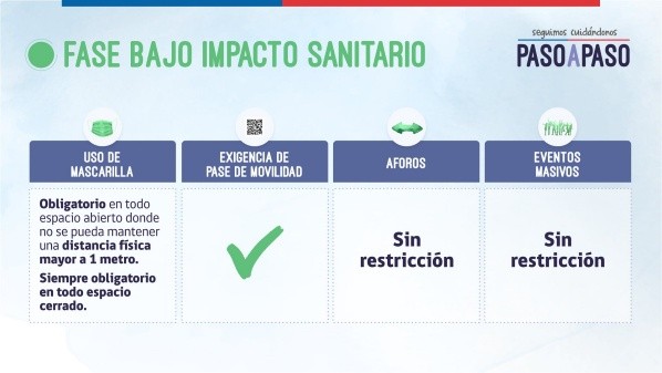 La etapa de Bajo Impacto Sanitario es lafase de menor restricción que es determinada según niveles de presión sobre la red asistencial, la circulación viral y la prevalencia de enfermedad grave y fallecimiento.La vacunación es uno de los indicadores favorables más importantes para llegar a esta instancia.