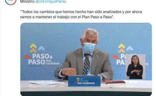 Respecto a los dichos del Palacios, el Ministro Paris respondió que pese a la baja de contagios, el Minsal no tiene en sus planes eliminar el Paso a Paso. “Por el momento no hay ninguna intención de suprimir este plan. Afortunadamente, aunque las cifras sigan bajando, nosotros vamos a mantener nuestra idea de trabajar en base a este Plan Paso a Paso”, señaló Paris.