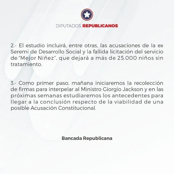 La idea es “estudiar todos los antecedentes e informaciones disponibles para preparar la presentación de una acusación constitucional en contra del ministro Giorgio Jackson por su responsabilidad política y jurídica en estas materias”, señalan.