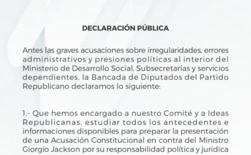 La bancada de diputados del Partido Republicano busca levantar una nueva acusación constitucional en el Gobierno del Presidente Gabriel Boric. Esta vez la acción iría dirigida al ministro de Desarrollo Social, Giorgio Jackson, por, supuestas: irregularidades, errores administrativos y presiones políticas indebidas al interior de la cartera.