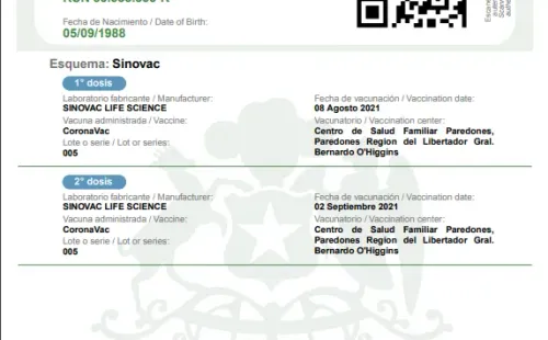El certificado está habilitado en español e inglés, con los datos de la persona y la información sobre el esquema de vacunación completo, entregando el nombre de la vacuna y la fecha de vacunación de ambas dosis. Además al igual que pase de movilidad se encuentra un código QR el cuál corresponde a la firma electrónica de la doctora Cecilia González, jefa del departamento de Inmunizaciones del Ministerio de Salud de Chile.