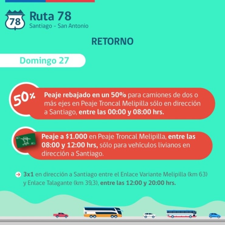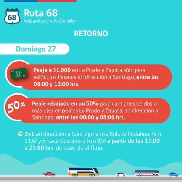 Domingo 27 de febrero (Peaje a Luca): entre las 08:00 horas y las 12:00 horas, solo para vehículos livianos, con dirección a Santiago.