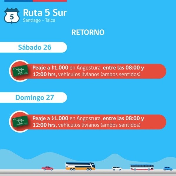 Sábado 26 de febrero (Peaje a Luca): entre las 08:00 horas y las 12:00 horas, para vehículos livianos, en ambos sentidos.