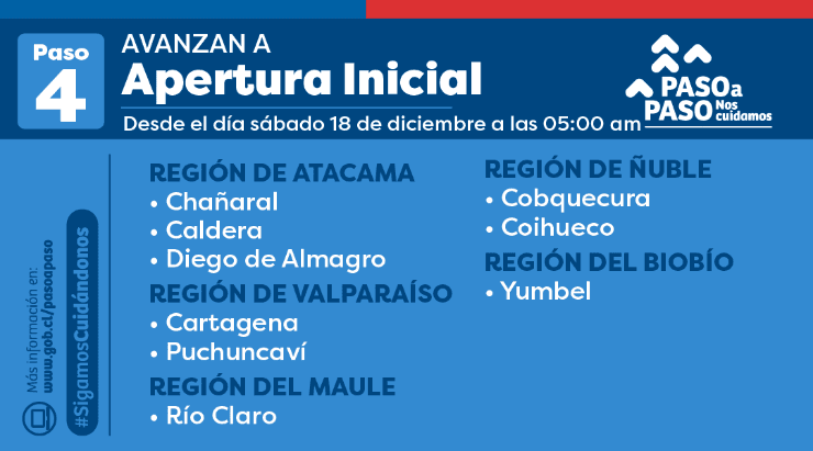 Avanzan a Fase 4 Apertura Inicial: Chañaral, Caldera, Diego de Almagro, Cartagena, Puchuncavi, Río Claro, Cobquercura, Coihueco y Yumbel.