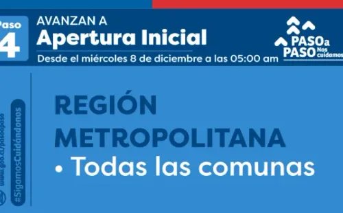 Las buenas cifras repercuten en el Plan Paso a Paso, donde se informó que toda la Región Metropolitana además de otras 22 comunas avanzarán a la fase de Apertura Inicial desde este sábado 8 de diciembre.