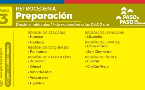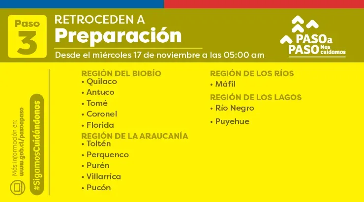 Retroceden a Fase 3 Preparación: Huasco, Caldera, Paihuano, Zapallar, Viña del Mar, Valparaíso, Olmué, Hijuelas, Litueche, Empedrado, San Clemente, Chillán, Chillán Viejo, Quilaco, Antuco, Tomé, Florida, Coronel, Toltén, Perquenco, Purén, Villa Rica, Pucón, Máfil, Río Negro y Puyehue