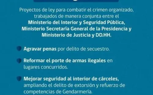 El Presidente Gabriel Boric anunció el envío de cuatro proyectos de Ley para enfrentar la delincuencia y el crimen organizado. Las iniciativas buscan aumentar las penas por los delitos de secuestro y porte de armas en espacios públicos, además, amplía el delito de extorsión y tipifica el delito de sicariato, estableciendo sanciones a quienes se asocien para cometer dicho ilícito.