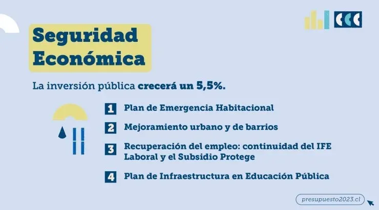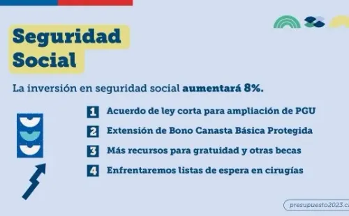 En materia de seguridad social y económica, Boric explicó que, “parte importante está destinado a financiar el avance de la pensión básica garantizada –Pensión Garantizada Universal (PGU)–, y también financiar políticas que nos van a permitir seguir haciéndole frente a la inflación y al alza en el costo de la vida, que sabemos que es una de las principales angustias” que actualmente aquejan a los bolsillos de la población.