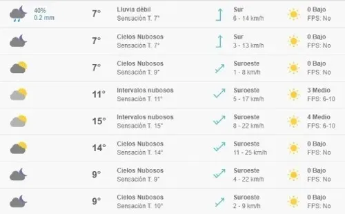 La temperatura máxima de este domingo llegará a los 15ºC y se registrará a las 14.00 horas. Mientras que la mínima será de 7ºC, temperatura que se presentará entre las 2.00 horas y las 8.00 horas.