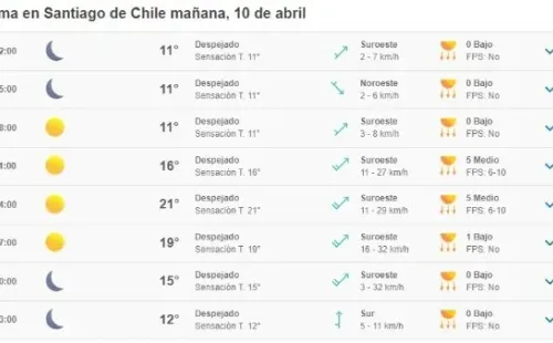Hoy sábado 9 de abril, la máxima llegará solo a los 23°C y la mínima será de 10°C. El día estará nuboso y el peak de temperatura ocurrirá a eso de las 15.00 horas, para comenzar a bajar a las 17.00 horas.