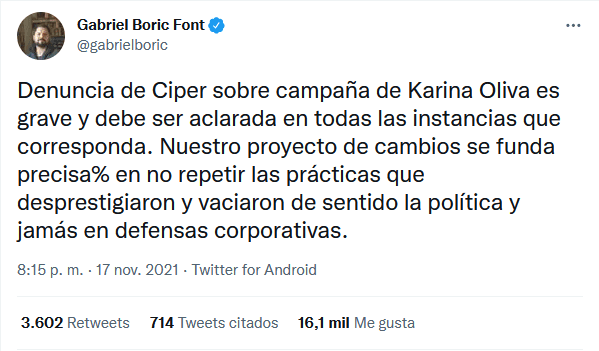 Desde el conglomerado salieron a criticar el hecho y el mismo abanderado presidencial, Gabriel Boric, llamó a aclarar los hechos “en todas las instancias que corresponda”. “Nuestro proyecto de cambios se funda precisamente en no repetir las prácticas que desprestigiaron y vaciaron de sentido la política”, sostuvo en twitter.