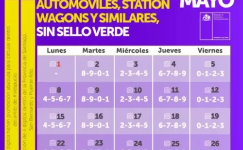 Este martes 2 de mayo comenzó en Santiago la restricción vehicular, medida que regirá hasta el31 de agosto de 2023, y funcionará de lunes a viernesentre las7:30 y las 21:00horas.