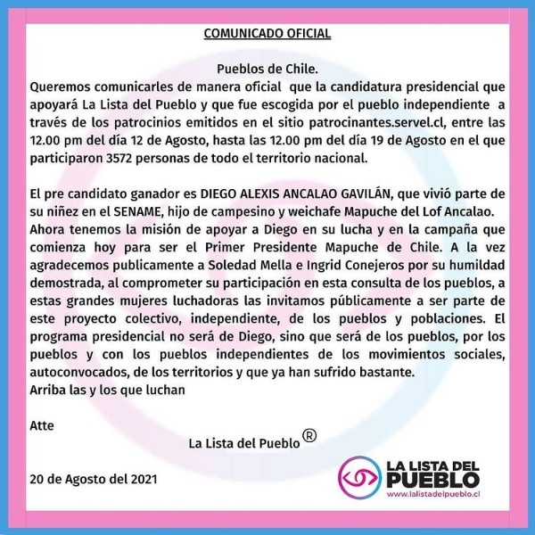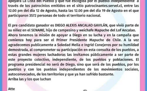 Según expresó La Lista del Pueblo, “ahora, tenemos la misión de apoyar a Diego en su lucha y en la campaña que comienza hoy para ser el Primer Presidente Mapuche de Chile”.